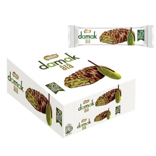 Nestlé Damak Ala Chocolate Wafers with Pistachio offer a delightful combination of crispy wafer, creamy pistachio filling, and smooth milk chocolate coating. Each 30g wafer is individually wrapped, making them perfect for sharing or enjoying on the go. The 25% pistachio content, including both a creamy filling and pieces within the chocolate, provides a rich and nutty flavor experience