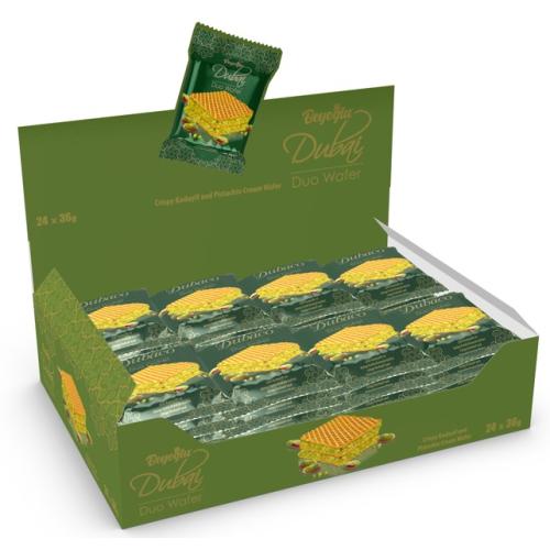 The Beyoglu Dubai Duo Wafer is a crispy, chocolate-coated wafer snack made with layers of rich cream and crispy kadayif (shredded pastry), with pistachio and milk chocolate.