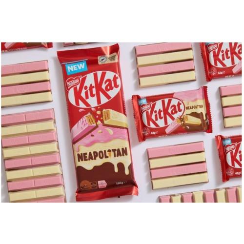 The Nestlé Kit Kat Neapolitan Block (165g) features a combination of strawberry, vanilla, and chocolate flavors, designed to mimic the taste of Neapolitan ice cream. It combines these three classic flavors with the familiar crispy wafer base of a Kit Kat. The bar is crafted with distinct layers of each flavor, offering a unique twist on the traditional Kit Kat experience.