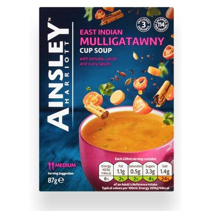 Ainsley Harriott's Mulligatawny Cup Soup is a convenient, low-fat instant soup featuring a warm blend of East Indian spices like cumin, coriander, turmeric, and chili, with tomato and carrot, creating a rich, aromatic, and subtly spicy flavor, ready in minutes with just boiling water for a comforting, low-calorie snack or quick meal.