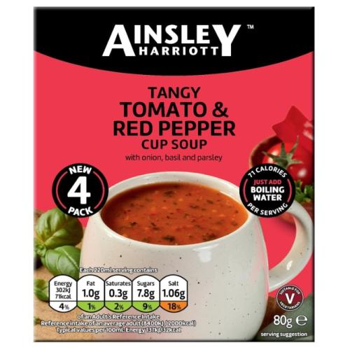 Ainsley Harriott Tomato & Roasted Red Pepper Cup Soup is a quick, low-fat instant soup featuring a blend of real tomato and roasted red pepper, with onion, basil, and parsley, perfect as a snack or light meal, ready in minutes by just adding boiling water, and contains no artificial colors, flavors, or preservatives. It offers a convenient, comforting taste, often highlighted for being vegetarian-friendly, and comes in convenient sachets for easy preparation.